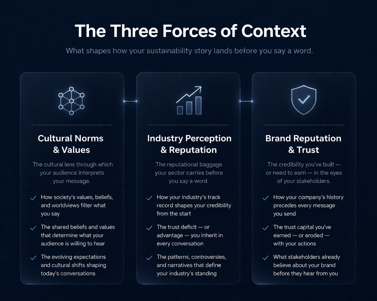 That's the wrong lesson. Context tells you where to start, what language to use, which audiences to prioritize, and what risks to anticipate. Two companies with identical sustainability performance can get completely different reactions from the same audience—because one understood the context it was communicating into and one didn't. That gap is where sustainability communicators earn their paycheck.
